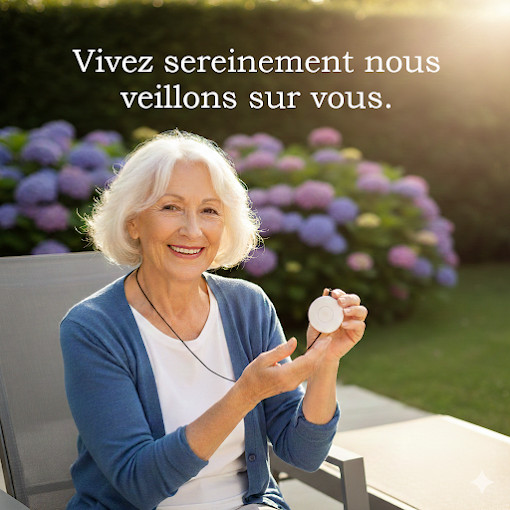 Profiter en toute confiance du confort de vie à domicile de manière active, en assurant bien-être et tranquillité d'esprit pour leurs proches, bouton d'alerte S.O.S et médaillon détection de chute.